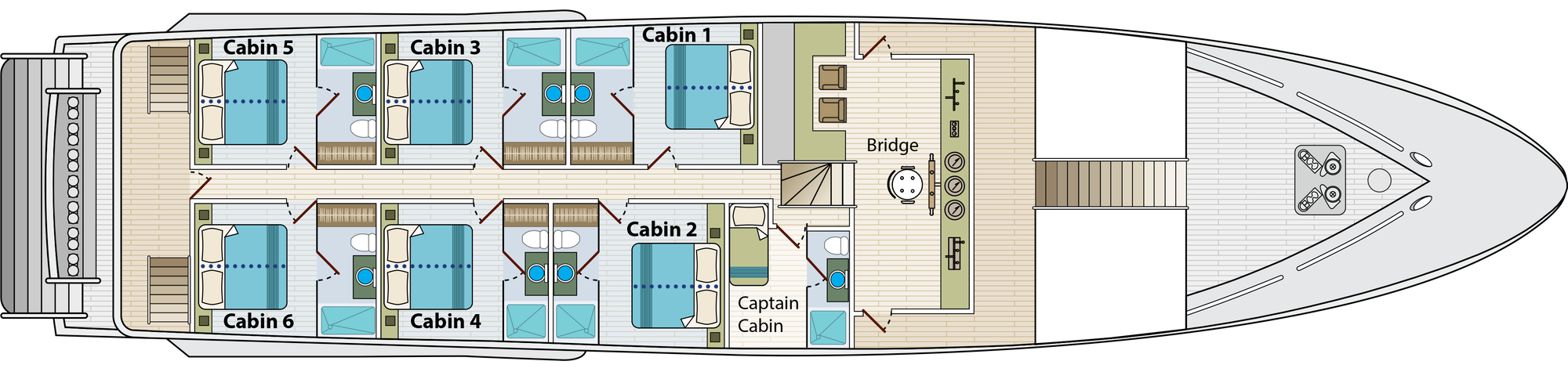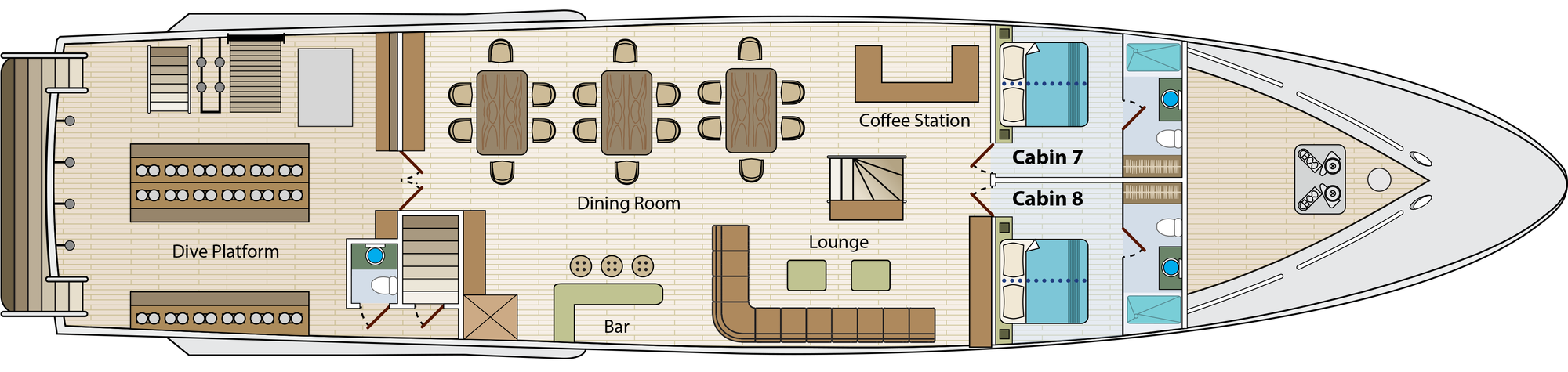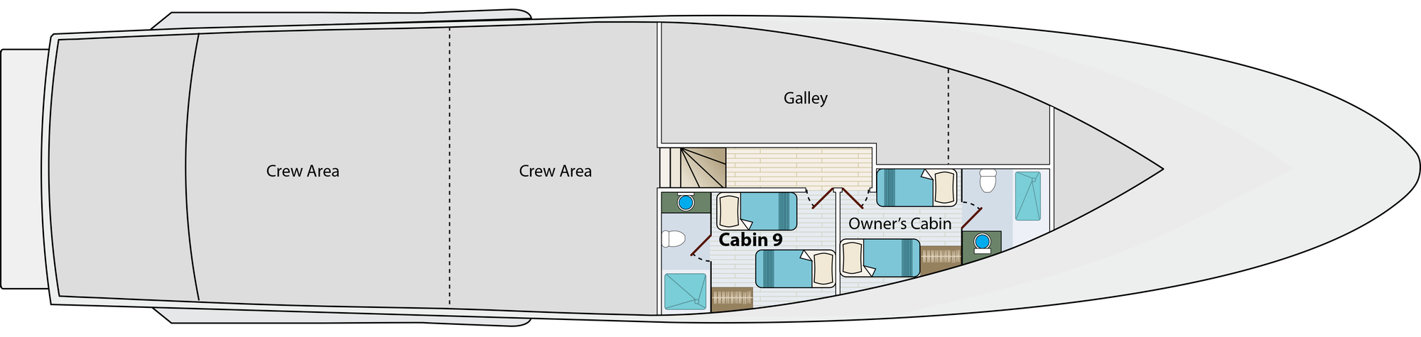 Calipso’s cabins are simple, functional, and designed for comfortable rest between active days exploring the islands. Layouts are straightforward, with deck location being the primary point of differentiation rather than cabin size.